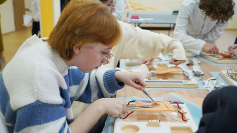 - Станция «Хирургия»: Школьники под руководством наставников познакомились с основами наложения хирургических швов, используя специальные тренажеры.